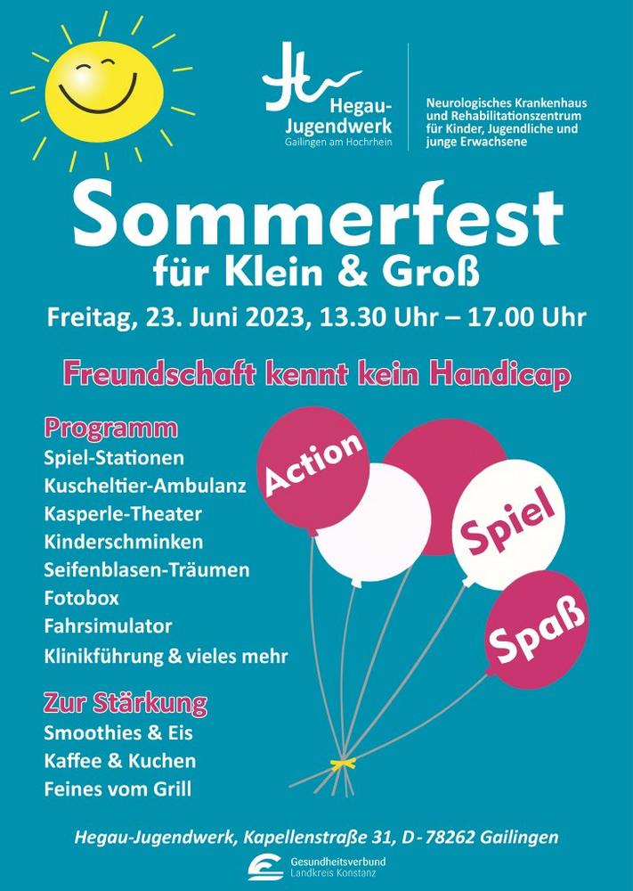 Sommerfest des Hegau-Jugendwerks Unter dem Motto „Freundschaft kennt kein Handicap“, möchten wir gemeinsam mit unseren Patienten und ihren Angehörigen, Freunden und Förderern, externen Besuchern und allen, die das Hegau-Jugendwerk gerne näher kennenlernen möchten ein schönes Sommerfest feiern. Unsere kleinen und großen Besucher erwartet ein kunterbuntes Rahmenprogramm mit Kasperletheater, Kinderschminken, Seifenblasen-Träumen, Fahrsimulator, der kaufBar mit einzigartigen Produkten aus der Berufstherapie des Hegau-Jugendwerks, tollen Spielstationen, Klinikführung, Unterstützter Kommunikation, dem HegauHelden e.V. u.v.m. Kinder, die ein Lieblingskuscheltier haben, das abgehört werden sollte oderWeiterlesen