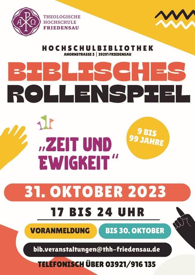 Spiel mit! Wer gerne in Gesellschaft spielt und Spiel und Spaß mit der Bibel, dem Glauben, dem Evangelium und Geselligkeit verbinden möchte, ist für Dienstag, 31. Oktober 2023, von 17 Uhr bis 24 Uhr, herzlich in die Hochschulbibliothek Friedensau eingeladen. Das biblische Rollenspiel „Zeit und Ewigkeit“ steht auf dem Programm. Der Eintritt ist frei. Teilnehmen können Kinder ab 9 Jahren, für Jugendliche und Erwachsene wird keine Altersgrenze gesetzt. Das Bibliotheksteam als Veranstalter gibt an „Geeignet von 9 bis 99“ –Weiterlesen