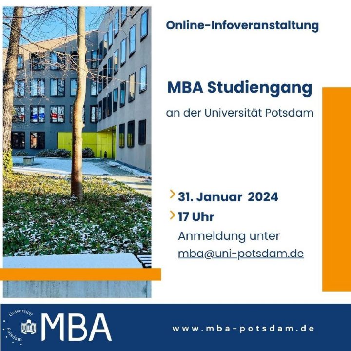 Am Mittwoch, den 31. Januar 2024 findet um 17 Uhr eine Online-Infoveranstaltung zum Studiengang Master of Business Administration (MBA) an der Universität Potsdam statt. Die Studiengangleiterin, Frau Dr. Roya Madani, gibt Ihnen einen Überblick über den Inhalt und die Organisation des berufsbegleitenden Studiengangs und steht anschließend zur Beantwortung Ihrer Fragen zur Verfügung. Interessenten erhalten auf Anfrage einen Link zur Veranstaltung. Anmeldungen nimmt das MBA-Team unter mba@uni-potsdam.de entgegen. Weitere Informationen finden Sie hier: www.mba-potsdam.de Eventdatum: Mittwoch, 31. Januar 2024 17:00 – 18:00Weiterlesen