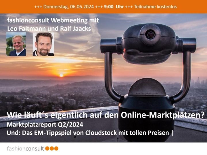 Online-Marktplätze: Trends und Entwicklungen Ralf Jaacks, Inhaber mehrerer Modehäuser an der Ostseeküste in der 3. Generation, präsentiert die neuesten Zahlen. Leo Faltmann wird mit Ralf die Auf- und Absteiger sowie die Entwicklung von Warenkörben, Preisreduktionen, Retouren und Kosten diskutieren. Außerdem: Das Wett-Tippen zur EM von cloudstock GmbH. Hauptpreis: Eine Auszeit an der Ostsee! Mehr erfahren? Die Teilnahme am Webmeeting ist kostenlos: Webmeeting fashionconsult am 6.6. um 9 Uhr. Das Video wird später exklusiv für Mitglieder von fashionconsult & friends verfügbarWeiterlesen