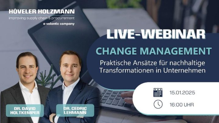 Jetzt anmelden Webinar: Change Management – Praktische Ansätze für nachhaltige Transformationen in Unternehmen Erfolgreiche Veränderungsprozesse erfordern mehr als nur gute Absichten – sie benötigen eine klare Strategie, geeignete Methoden und vor allem die aktive Einbindung aller Beteiligten. Genau hier setzt unser Webinar an: Dr. David Holtkemper (Principal) und Dr. Cedric Lehmann (Manager) vermitteln Ihnen praxisorientierte Ansätze und Tools, um Change Management gezielt und nachhaltig umzusetzen. • Wann braucht man Change Management?Schlüsselsituationen und Auslöser, in denen Change Management unverzichtbar ist. •Weiterlesen