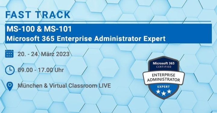 Der Kurs MS-100 & 101 vermittelt Ihnen Kenntnisse, wie Sie Microsoft 365 Enterprise Dienste auswerten, planen, migrieren, bereitstellen und verwalten. Die Zertifizierung zum „Microsoft Certified Enterprise Expert“ können Sie nach dem Kurs im Pearson VUE Testcenter oder Online absolvieren. Eventdatum: 20.03.23 – 24.03.23 Eventort: Online Firmenkontakt und Herausgeber der Eventbeschreibung: CBT Training & Consulting GmbHElektrastraße 6a81925 MünchenTelefon: +49 (89) 4576918-12Telefax: +49 (89) 4576918-25http://www.cbt-training.de Weiterführende Links Zum Event Originalinserat von CBT Training & Consulting GmbH Alle Events von CBT Training &Weiterlesen