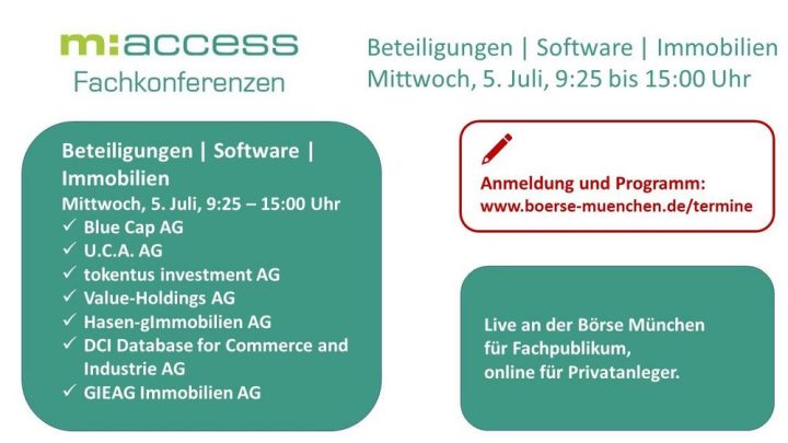 Die Fachkonferenz Beteiligungen/Softwarte/Immobilien findet hybrid statt. Institutionelle Investoren, Analysten und Journalisten sind herzlich in den Räumen der Börse München am Karolinenplatz nach Anmeldung willkommen. Privatanleger und Interessierte können kostenlos online teilnehmen.