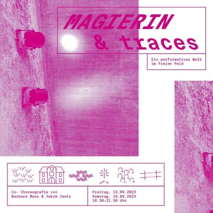 Freitag, 15.09.2023Samstag 16.09.2023jeweils 18:30 Uhr – ca. 21:30 UhrAlte Schule KirchfembachMAGIERIN & tracesein performativer Walk im freien Feld Performance: Barbara Bess, Cyrena Dunbar, Jakob Jautz, Maria Magdalena Mund / Choreographie/ Installation: Barbara Bess (MAGIERIN), Jakob Jautz (traces) / Installation Sandpendel: Peter Heinzel / Beratung Sound: Lars Fischer / Beratung Licht: Rudyard Schmidt / Öffentlichkeitsarbeit/ Texte: Stephanie Mehnert / Assistenz: Ida Biegel Im performativen Walk „MAGIERIN“, transformiert die Choreographin Barbara Bess ihren Arthouse Film „COMET“ in eine leiblich erlebbare Form. So entstehenWeiterlesen