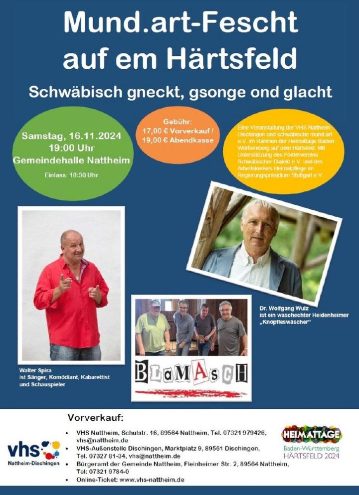 Schwäbisch gneckt, gsonge ond glachtmit Wolfgang Wulz, Walter Spira und BLAMASCH Samstag, 16. November 2024, 19 Uhr, Saalöffnung 18.30 UhrGemeindehalle, Schulstraße 16, 89564 NattheimEintritt: 17 € Vorverkauf, 19 € Abendkasse Eine Veranstaltung der VHS Nattheim-Dischingen und schwäbische mund.art e.V. im Rahmen der Heimattage Baden-Württemberg auf dem Härtsfeld. Mit Unterstützung des Fördervereins Schwäbischer Dialekt e.V. und des Arbeitskreises Heimatpflege im Regierungspräsidium Stuttgart e.V. Ein vielfältiges schwäbische Programm bieten die sechs Künstler des in Württemberg aktiven Vereins schwäbische mund.art e.V. beim Mund.art-FeschtWeiterlesen