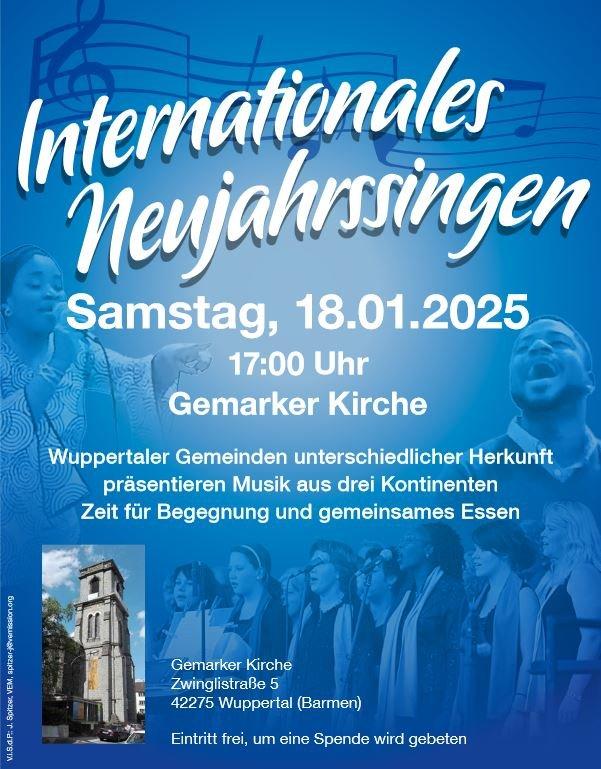 Bei der dritten Auflage des „Internationalen Neujahrssingens“ wird mit ganz unterschiedlichen Rhythmen, Klängen und Gesängen ein musikalisches Fest gefeiert, das Christ*innen in Wuppertal verbindet und verbündet in der Gewissheit des gemeinsamen Glaubens. Mit dabei sind Musiker*innen aus der mehrheitlich afrikanisch geprägten Church of Peace, der tamilischen Gemeinde innerhalb der katholischen Nachbargemeinde St. Antonius, des Chors der Internationalen Evangelischen Gemeinschaft (IEG) und der amaSing Praiseband der gastgebenden Gemeinde Gemarke-Wupperfeld. Die Besucher*innen werden an verschiedenen Stellen zum Mitsingen eingeladen.