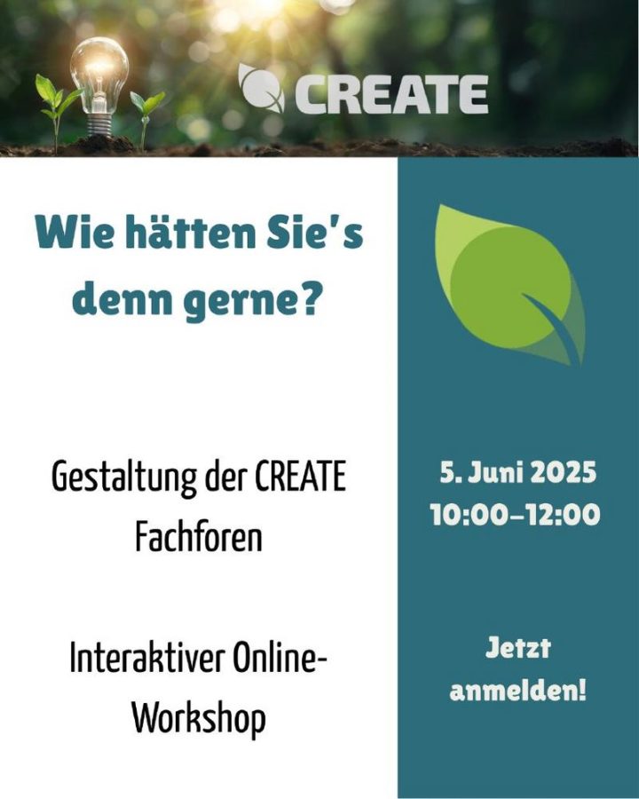 Das Innovationsnetzwerk CREATE lädt am 5. Juni 2025 von 10:00 bis 12:00 Uhr zum nächsten Online-Workshop ein. Im Mittelpunkt steht die inhaltliche und organisatorische Ausgestaltung der fünf Fachforen. Teilnehmende bringen ihre Themen und Erwartungen direkt ein. „Wie hätten Sie’s denn gerne?“ – Gestaltung der CREATE Fachforen In diesem interaktiven Online-Workshop werden die Themen und Rahmenbedingungen der fünf Fachforen festgelegt, die künftig die inhaltliche Arbeit im Netzwerk tragen. Teilnehmende gestalten aktiv mit, woran und wie in den kommenden zwei Jahren gearbeitetWeiterlesen