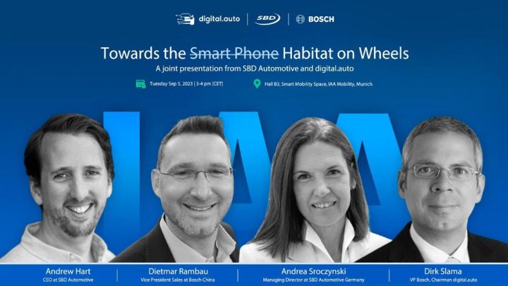 SBD Automotive und digital.auto präsentieren sich zum ersten Mal gemeinsam auf der diesjährigen IAA Mobility: die Geschäftsführerin von SBD Deutschland, Andrea Sroczynski, moderiert mit Prof. Dirk Slama (Chairman von digital.auto) eine spannende Podiumsdiskussion mit dem Titel „Towards the Smart Phone Habitat on Wheels“  in Halle B3 des Smart Mobility Space auf der IAA. Auf der Veranstaltung diskutieren Andrew Hart (CEO SBD Automotive) und Andrea Sroczynski zusammen mit Dietmar Rambau, Vice President of Sales bei Bosch China, und Dirk Slama, ViceWeiterlesen