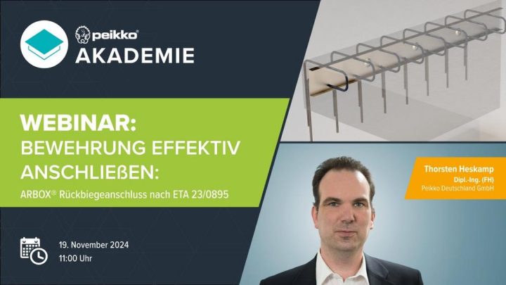 Entdecken Sie den ARBOX® Rückbiegeanschluss Der ARBOX® Rückbiegeanschluss wird eingesetzt, um Betonbauteile, die in verschiedenen Abschnitten betoniert werden, in effizienter Weise miteinander zu verbinden. Erfahren Sie in unserem kostenlosen Webinar am 19.11.2024 ab 11 Uhr, welche Vorteile Sie durch den Einsatz von ARBOX® erzielen können. Dipl.-Ing. (FH) Thorsten Heskamp, Customer Engineer bei Peikko Deutschland GmbH erläutert Ihnen praxisnah die Anwendungsbereiche und Einsatzmöglichkeiten sowie die ETA-Zulassungen und Normkonformität. Ein weiterer Schwerpnkt wird auf der Bemessung mit konkreten REchenbeispielen liegen. Über diesen LinkWeiterlesen