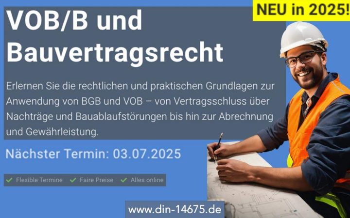VOB/B und Bauvertragsrecht   Erlernen Sie die rechtlichen und praktischen Grundlagen zur Anwendung von BGB und VOB – von Vertragsschluss über Nachträge und Bauablaufstörungen bis hin zur Abrechnung und Gewährleistung.   Das erfahren Sie in der Onlineschulung: Vertragsschluss VOB und BGB im Bauvertrag Nachtragsprüfung – Grundlagen VOB gerecht ausschreiben Preiskalkulation – Grundlagen Nachträge im Einheitspreisvertrag Nachträge im Pauschalpreisvertrag und bei Leistungen ohne Auftrag Rechtsprechung Bauablaufstörungen Ursache für Mehrkosten Regelungen im BGB Regelungen in der VOB Teil 1 Fristenverlängerungen Regelungen inWeiterlesen