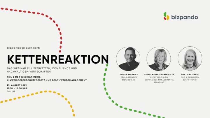 Am 23. August geht die „Kettenreaktion“, eine neue Eventreihe zu allem rund um Lieferketten, Compliance und nachhaltiges Wirtschaften, in die zweite Runde: In dieser Ausgabe sprechen wir über das seit dem 2. Juli aktive Hinweisgeberschutzgesetz (HinSchG) und das Beschwerdemanagement im Rahmen des Lieferkettensorgfaltspflichtengesetzes (LkSG). Das Webinar ist insbesondere für kleine und mittelständische Unternehmen (KMU) relevant, die wissen wollen, welche Anforderungen und Pflichten sie im Rahmen des HinSchG und des LkSG erfüllen müssen und wie sie das am besten angehen. Wir geben Ihnen TippsWeiterlesen