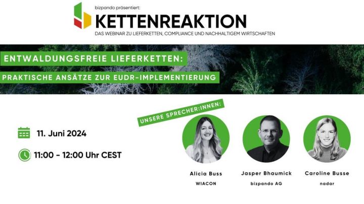 Am 11. Juni geht die Kettenreaktion in die nächste Runde! Thema: Entwaldungsfreie Lieferketten: Praktische Ansätze zur EUDR-Implementierung Datum: 11. Juni Uhrzeit: 11:00 – 12:00 Uhr Sprecher:innen: Alicia Buss, ESG Compliance Consultant bei WIACON, Caroline Busse, Co-Founder und CEO von nadar, und Jasper Bhaumick, CEO der bizpando AG, Moderation: Sarah Sellner In der vierten Ausgabe unserer Webinarreihe zeigen wir mit den Expert:innen, wie Unternehmen entwaldungsfreie und transparente Lieferketten schaffen können und welche Rolle die EU-Entwaldungsverordnung dabei spielt. In dem kostenfreien Webinar erhaltenWeiterlesen
