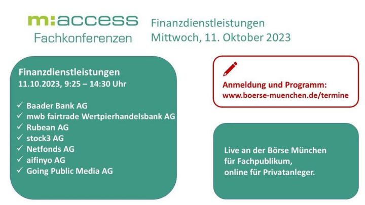 Die Fachkonferenz Finanzdienstleistungen am Mittwoch, den 11. Oktober 2023, findet als Hybrid-Veranstaltung statt. Die Teilnahme an der Präsenzveranstaltung in den Räumen der Börse München am Karolinenplatz ist für institutionelle Investoren, Analysten und Journalisten möglich. Es präsentieren sich mit der Baader Bank AG, die mwb fairtrade Wertpapierhandelsbank AG, die Rubean AG, die stock3 AG, die Netfonds AG, die aifinyo AG und die Going Public Media AG ein bunter Mix aus der mittelständischen Finanzbranche. Mehr Informationen, das Programm und die Anmeldung findenWeiterlesen