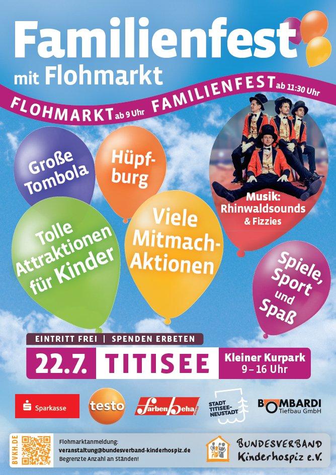 Am 22. Juli 2023 findet im kleinen Kurpark, in Titisee, das Familienfest mit Flohmarkt statt. Den Auftakt, um 09:00 Uhr, bildet der Flohmarkt. Zu diesem können Sie sich bei Kevin Berthold anmelden: 07653 / 826 40 84. Das Familienfest beginnt um 11:30 Uhr und wartet mit einer großen Tombola, einer Hüpfburg sowie jeder Menge an Spielen, Spaß und Sport auf. Musikalisch wird das Fest von der Band Rhinwaldsounds mit Dominik Büchele untermalt. Der Bundesverband Kinderhospiz e. V., der die öffentliche Veranstaltung ins LebenWeiterlesen
