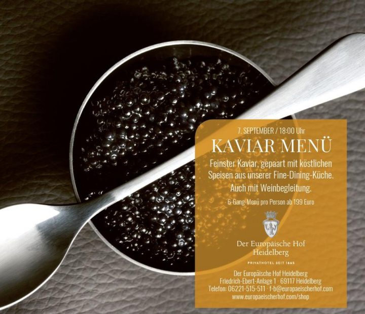 Luxus & Genuss: Feinster Kaviar, gepaart mit köstlichen Speisen aus unserer Fine-Dining-Küche. Genießen Sie unser elegantes 6-Gang-Kaviar-Menü. Auch gerne mit einer passenden Weinbegleitung aus erlesenen Tropfen. Wir freuen uns auf Ihren Besuch. 6-Gang-Menü 199 Euro pro Person  6-Gang-Menü mit Weinbegleitung 284 Euro pro Person  Eventdatum: Samstag, 07. September 2024 18:00 – 23:00 Eventort: Heidelberg Firmenkontakt und Herausgeber der Eventbeschreibung: Der Europäische Hof Hotel Europa Heidelberg GmbHFriedrich-Ebert-Anlage 169117 HeidelbergTelefon: +49 (6221) 5150Telefax: +49 (6221) 515506http://www.europaeischerhof.com Weiterführende Links Zum Event Originalinserat vonWeiterlesen