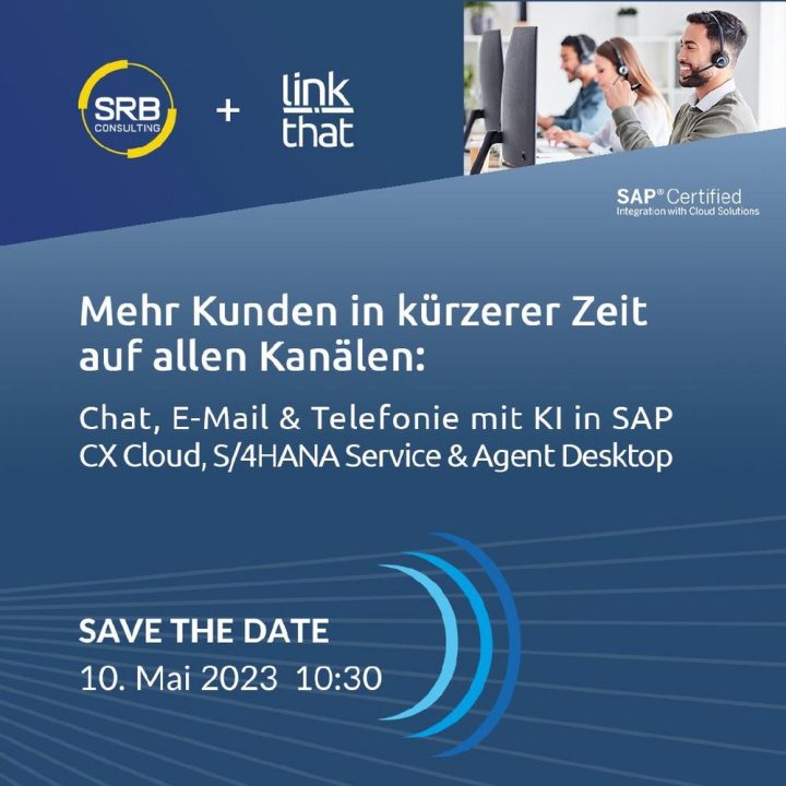 Save the Date: am 10. Mai um 10.30 Uhr startet das nächste Webinar von LinkThat. Dabei zeigen wir gemeinsam mit SRB Consulting wie effizient Kundenservice auf allen Kanälen sein kann. Mehr Kunden in kürzerer Zeit auf allen Kanälen: Chat, E-Mail & Telefonie mit KI in SAP CX Cloud,S/4HANA Service & Agent Desktop Webinar: Mittwoch, 10.05.2023 ab 10:30 UhrDauer: ca. 30 Minuten inkl. Fragerunde im Anschluss Jetzt Platz sichern! Wir freuen uns auf Sie! Eventdatum: Mittwoch, 10. Mai 2023 10:30Weiterlesen